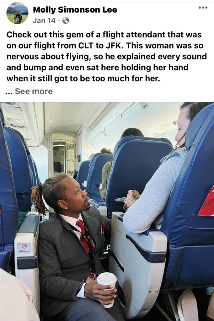 Floyd sat down next to the passenger, grabbed her hand, and asked her if she was okay. The passenger told Floyd that she’s had bad flight experiences in the past, and she was feeling very nervous.
