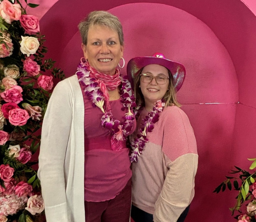 Decked out in Hawaiian leis, pink hoop earrings and a pink scarf, Patricia joined the flight as someone currently battling the disease. Patricia was diagnosed with Stage 4 breast cancer in December 2022 after noticing a rash on her body. After initially thinking it was shingles, tests led to a breast cancer diagnosis, and she began treatment in February 2023. Patricia’s current treatment plan involves taking three pills each morning for three weeks, and then she has a week off.