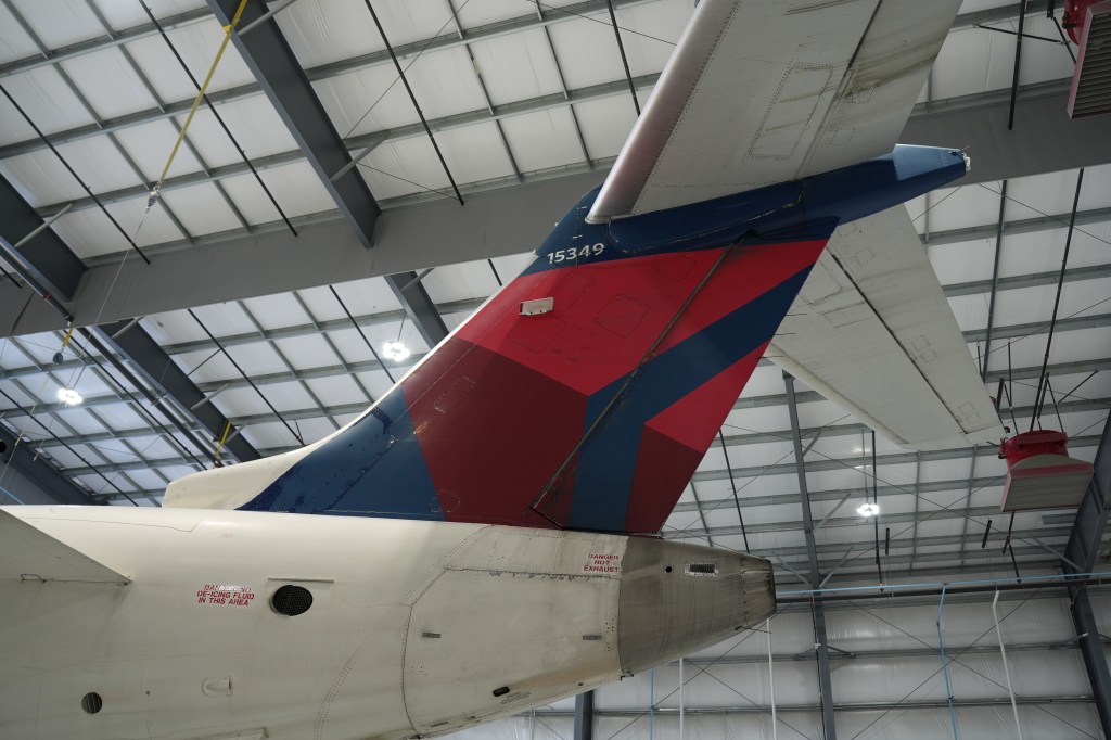 Blue paint is applied to the belly, Delta Connection titles, Delta logo, and nose and winglets. Wings, surrounding doors, and the horizontal stabilizer are painted gray.