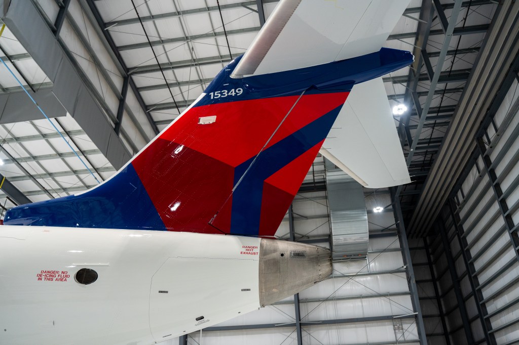 Stencils are placed for logos, the N-number, and the Delta widget. The widget is laid out free-hand and painted in Delta red. The blue wave is carefully measured for proper curvature, and white paint is applied to the fuselage. Reps inspect the transition line for overspray.